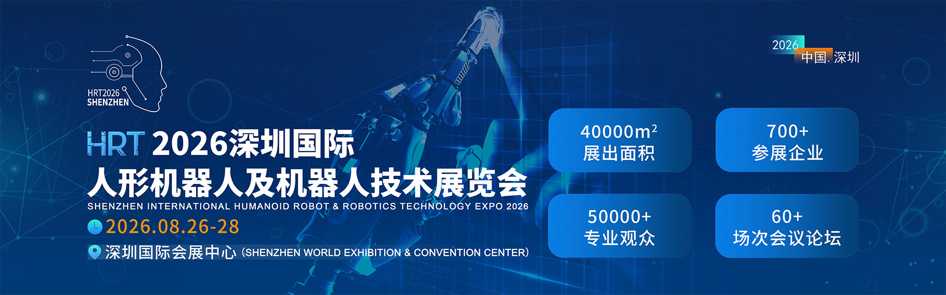 为进一步加速技术成果转化,更便捷的打通人形机器人上下游产业链贸易合作关系,推动人形机器人从实验室 技术向万亿级产业的跨越,由香港贸发展览集团主办,上海贸发展览服务有限公司承办的2026深圳国际人形机器人及机器人技术展览会(简称:HRT深圳机器人展)将于2026年08月26-28日在深圳国际会展中心盛大开幕。 展会聚焦人形机器人全产业链技术生态,汇聚全球顶尖企业、科研机构与行业专家,旨在打造一个具备国际化、规模化、专业化,集产品技术展